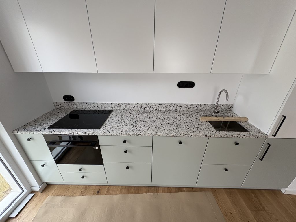Dowodem jest blisko 280 cm blat oraz tej samej długości cokół naścienny (pocieniony z 30mm do 12mm), które po naszym montażu prezentują się tak…